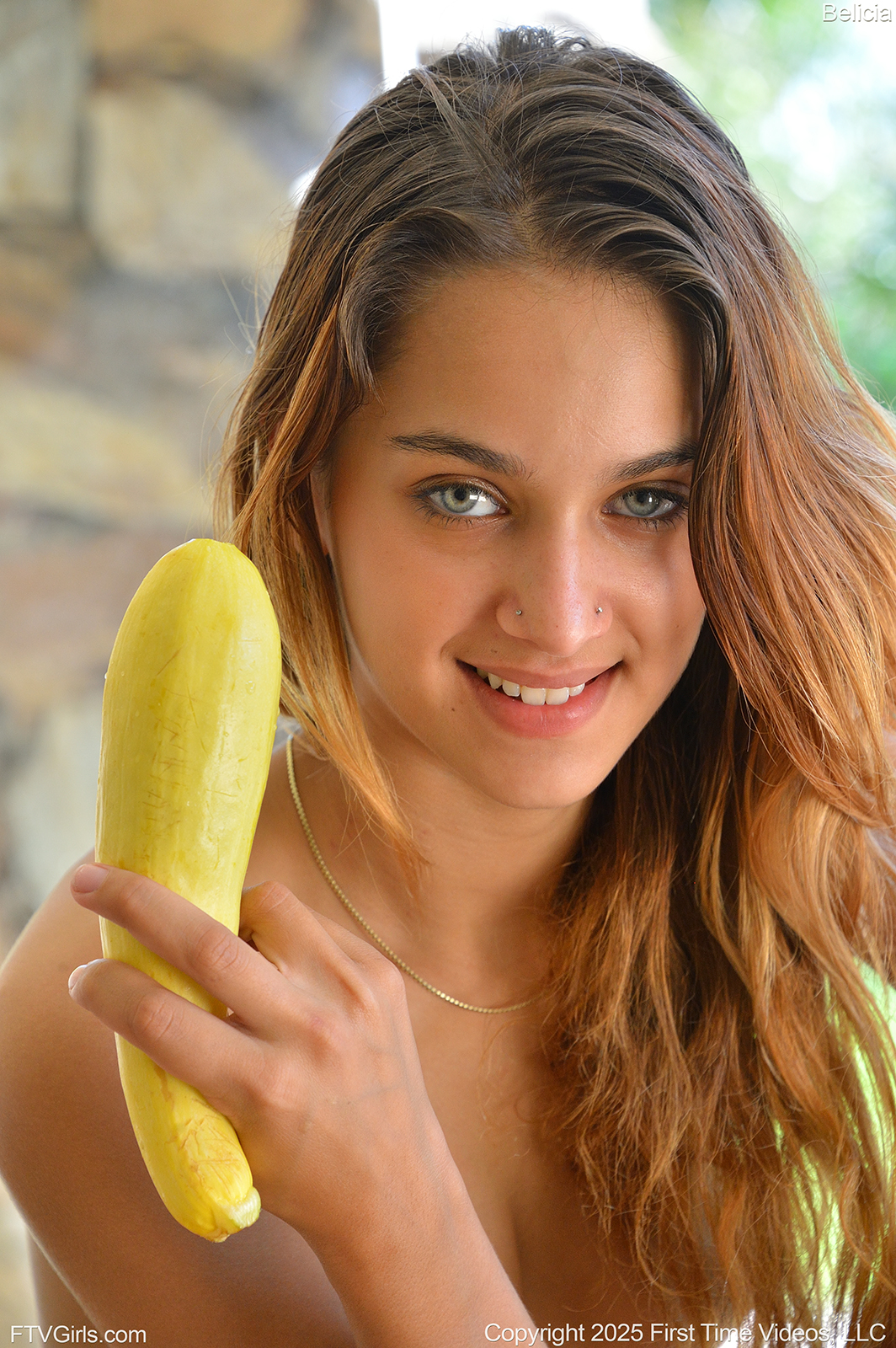 So on the part 2 of her shoot, we decided to do something more sporty. She's got those perfect abs, but not shorts or skirts to wear (because she barely brought any clothes with her). Which worked fine, we just ended up shooting her bottomless with the skimpy top on to show off her abs. She's played soccer for a long time, and so it made sense to follow that sporty theme with her hair in a ponytail. Notice her socks however (weed patters -- she's a pot smoker allright -- aren't all California teens doing that nowadays?). In no time she's completely naked... then finding a long cucumber to penetrate herself standing up, and then riding it in the grass. Hot views of the penetration from different angles. Back home, she experiments with a bottle, pushing it as deep as it can go, getting past the wide end... Notice her milky white juices build up on the bottle, which she then pulls out and rubs on her nipples like cream! She tries going as deep as possible by sitting on it and using her body weight. Also notice the suction sound as I had her pull it in and out. More veggie action continues as she tries to use a large summer squash, but its too wide and she can't get most of it in... so she uses a banana instead! She fucks herself hard with the banana, until its turned to mush... She likes to sing and dance, so we see her do that next, in the nude, with her own unique way of dancing. To end the day, we enjoy her figure in a cute bra & panties, showing off and massaging her firm breasts & butt, then gaping her vagina from behind and fingering herself. By this point she was burned out, not used to getting up early and flying on a plane to do all this in one day, so it was time to wrap up this shoot. Lets not forget that she's also doing this stuff for the first time, and its a lot of 'adventure' for one day!
