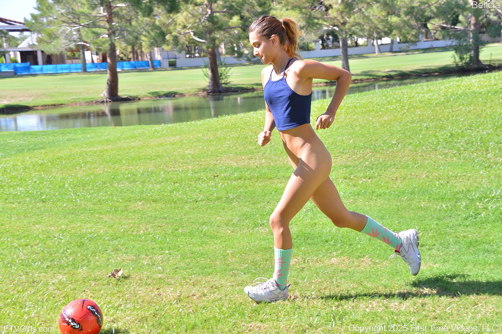 So on the part 2 of her shoot, we decided to do something more sporty. She's got those perfect abs, but not shorts or skirts to wear (because she barely brought any clothes with her). Which worked fine, we just ended up shooting her bottomless with the skimpy top on to show off her abs. She's played soccer for a long time, and so it made sense to follow that sporty theme with her hair in a ponytail. Notice her socks however (weed patters -- she's a pot smoker allright -- aren't all California teens doing that nowadays?). In no time she's completely naked... then finding a long cucumber to penetrate herself standing up, and then riding it in the grass. Hot views of the penetration from different angles. Back home, she experiments with a bottle, pushing it as deep as it can go, getting past the wide end... Notice her milky white juices build up on the bottle, which she then pulls out and rubs on her nipples like cream! She tries going as deep as possible by sitting on it and using her body weight. Also notice the suction sound as I had her pull it in and out. More veggie action continues as she tries to use a large summer squash, but its too wide and she can't get most of it in... so she uses a banana instead! She fucks herself hard with the banana, until its turned to mush... She likes to sing and dance, so we see her do that next, in the nude, with her own unique way of dancing. To end the day, we enjoy her figure in a cute bra & panties, showing off and massaging her firm breasts & butt, then gaping her vagina from behind and fingering herself. By this point she was burned out, not used to getting up early and flying on a plane to do all this in one day, so it was time to wrap up this shoot. Lets not forget that she's also doing this stuff for the first time, and its a lot of 'adventure' for one day!