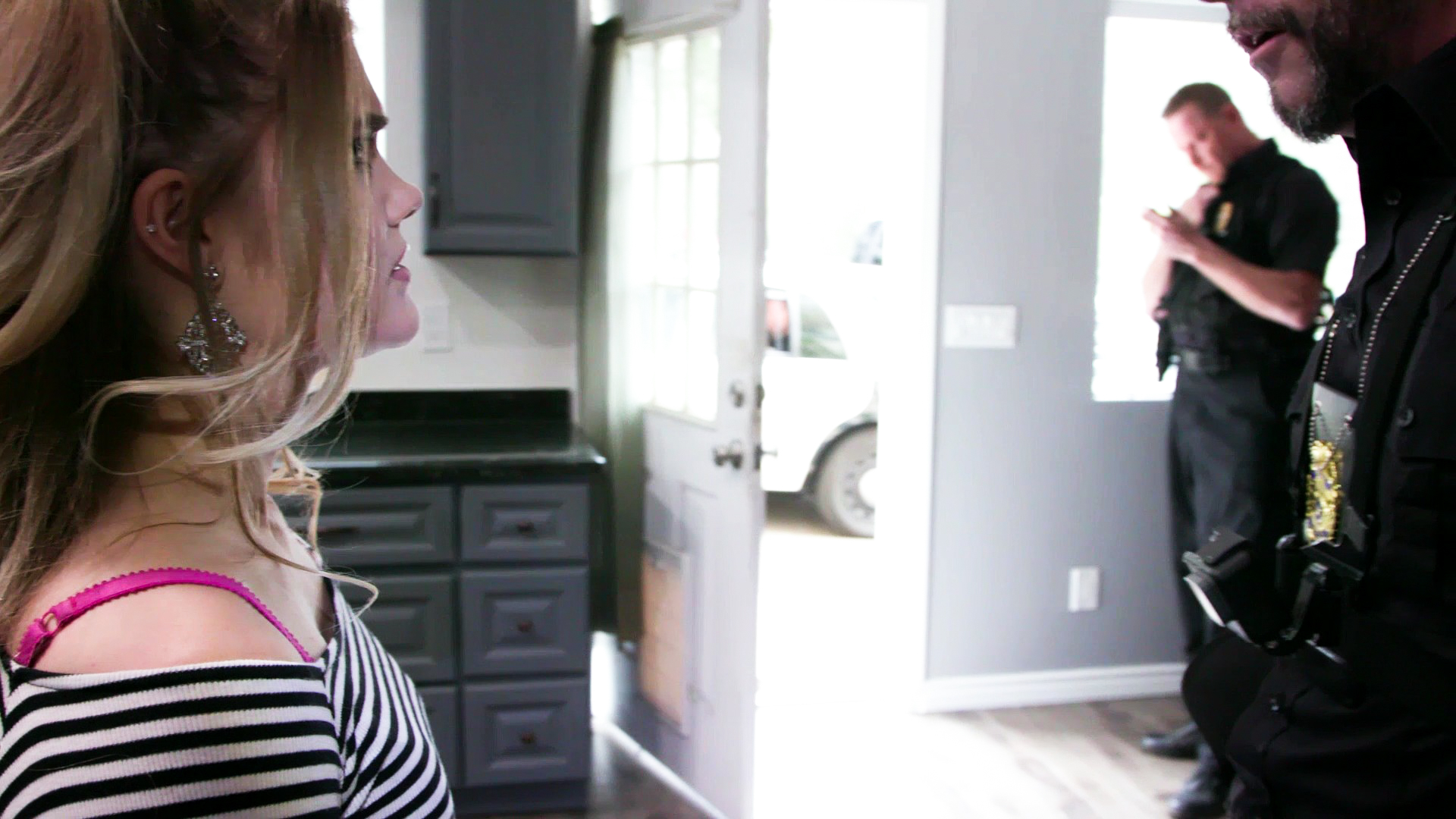 Officers Dick Chibbles and Jack Vegas are doing their afternoon rounds. When they receive a call about an armed suspect, they waste no time driving to the house. As they knock on the door, Brooke Karter answers it and asks them what they want. When they inquire as to the whereabouts of the suspect, she lies to them, saying he's not here. But when they see him trying to escape from the kitchen window, they apprehend the suspect and cuff him. They read him his rights and put him in the squad car. When they go back into the house, they demand identification from the girlfriend. As they grill her with questions, they inform her that harboring a fugitive can get her 5 to 8 years in a state penitentiary. She keeps telling them she's innocent but they know a liar when they see one. They cuff her and start roughing her up as they grab her by the throat and yell in her face, demanding that she tell them where her boyfriend was an hour and a half ago, 'cuz he sure as hell wasn't home with her. Playing good cop, they offer her an ultimatum: tell them the truth and she doesn't go to jail. Satisfied with her reply, the cops go to leave but Brooke isn't going to let them take her boyfriend away from her. When she blurts out something about sex, the cops pause for a moment and ask her what she means. When she gets on her knees and starts sucking Jack Vegas dick, the message becomes crystal clear.