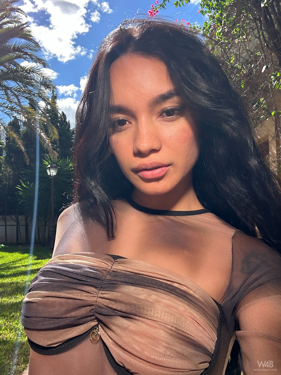 Hi, sweethearts, it's me, Dulce. I love taking photos outdoors in nature, in beautiful places, and this time I was by the pool and there was beautiful light under the palm trees in the shade. I took a photo for you on my phone and someone filmed me doing it. It's a gift for you, so you'll remember me. Do you love me?