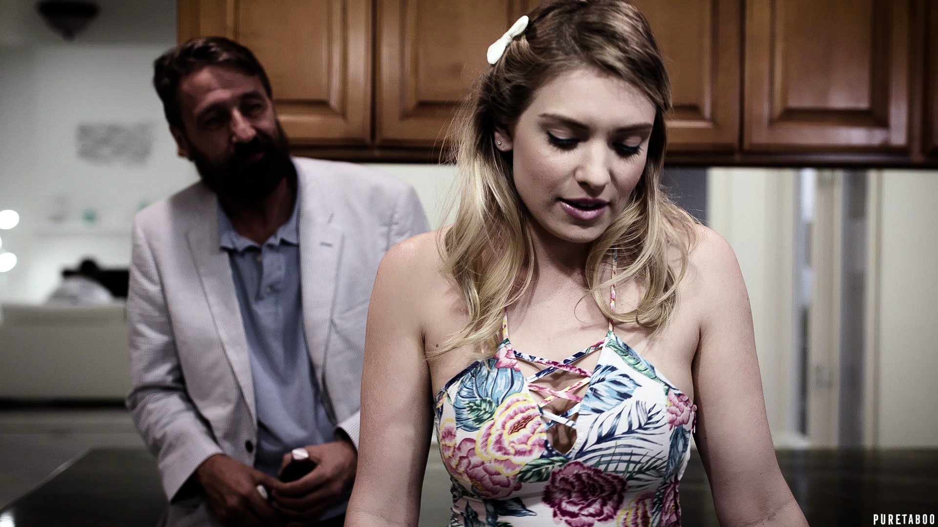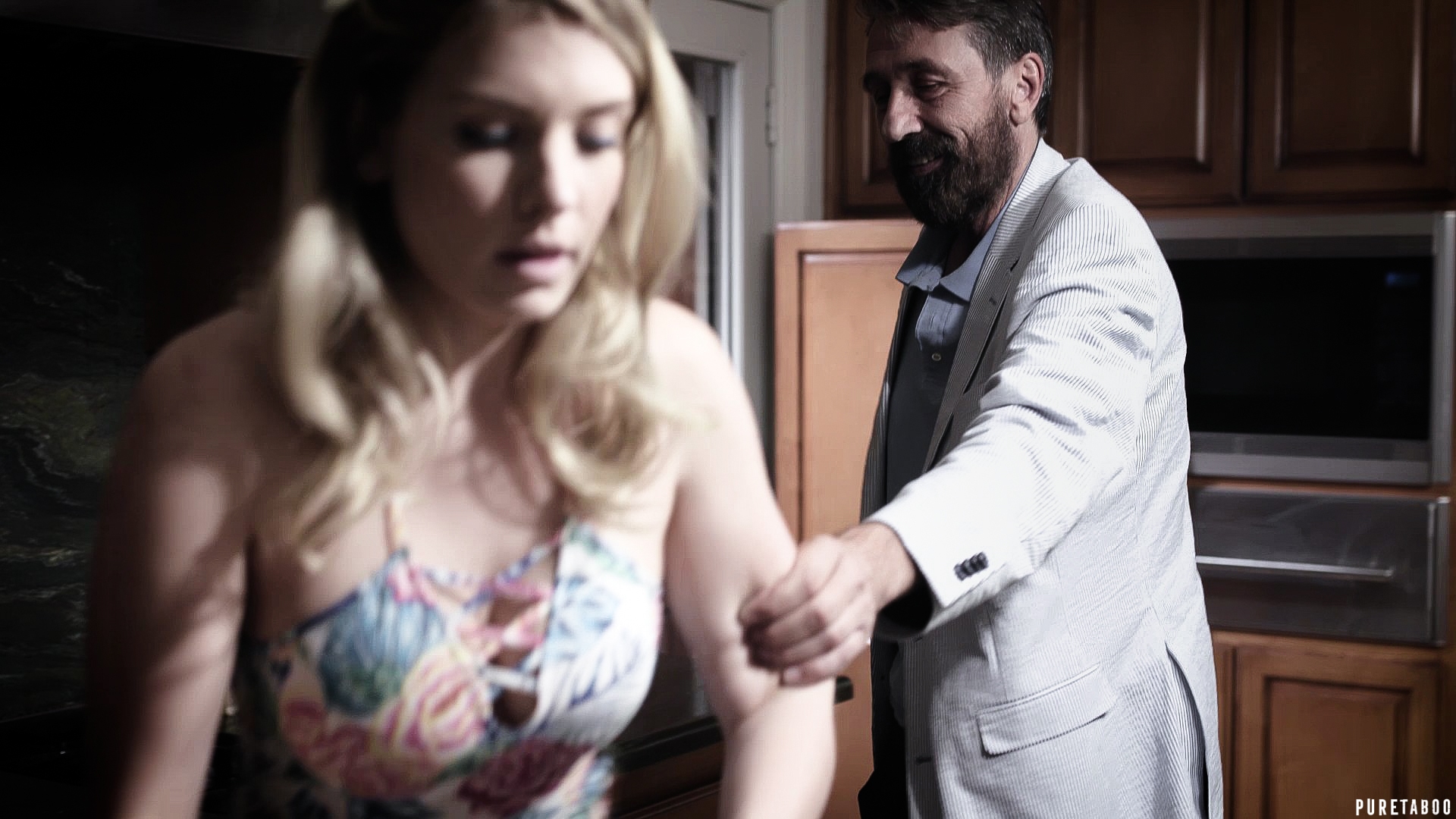 SCENE opens on Jessica, a precocious 18-year-old girl, as she sits knees tucked on her bedroom floor finishing her makeup in front of a mirror. She smiles and pouts at herself, taking a few selfies, before overhearing her father call her into the kitchen. It's Sunday, the day of the big game, and he is having several buddies over ... including John, a man who's always been like an Uncle to Jessica and someone she's crushed on for years. When she struts in the kitchen, Jessica's father is shocked. How come she is dressed up like that? She is way too young to be wearing such provocative clothing! Jessica tries to protest, telling her dad its just what teenage girls wear these days, but dad is insistent that she go back and change. His friends are coming over, for goodness sake! She had promised to help him host ... not be a slut! Jessica glares at her father before storming back into her room and slamming the door.Jessica's bedroom door slowly opens, as she creeps out into the hall amid sounds of men cheering and laughing in the other room. The game has begun. The camera slowly pans out to reveal the teenager dressed in another provocative outfit ... despite what her father said. She looks smug as she walks into the kitchen, grabs a bowl of chips, and makes her way towards the living room. Her father and his two buddies are all engrossed in the game when Jessica asks if anyone wants a beverage ... and awkwardly says hi to John. Jessica's father looks annoyed when he sees her outfit but can't say anything in front of his friends, so he just shoos her off. John, on the other hand, seems fixated on the 18-year-old. He asks if she needs any help and follows her back to the kitchen.Jessica tries to act mature and sophisticated with John, to impress him. After telling him her college plans, she gushes that he is her favorite Uncle, even if they aren't related. She reminisces about all the good times they've had over the years, with John hanging around the house and being her dad's best friend. John is charming and sweet with Jessica, all the while keeping an eye on her father in the other room. At a certain point, he leans in and whispers something about wanting to eat her pretty little pussy. Jessica is stunned, assuming she's misheard. She asks him to repeat himself and he just smiles, saying he wants to eat the chips ... before walking back to the living room. Jessica flushes red. Did he just really say that?!One Hour LaterJessica sits wedged on the couch with her father and his friends. They are all still engrossed in the game, while she looks nervous. She keeps thinking about what John said. He is staring at her now and starting to play footsie with her subtly, right in front of her father. The light teasing continues until Jessica can't handle it anymore and excuses herself to go refill the chips.Inside the kitchen, she opens the pantry and grabs a bag, opening its contents into the bowl. When she turns around, John is standing right behind her. He startles her so much that she drops the chips on the floor. Embarrassed, she apologizes for being so jumpy and leans over to pick them up. John is still sweet and charming but doesn't do anything to help her ... instead, he just looms over her as she bends down, ass innocently up in the air. There is something strange about the way he is calmly watching her while keeping an eye on the men in the other room. By the time Jessica gets back up, there is an uncomfortable silence between them. She squirms awkwardly as John stares at her, inching closer.'Jessica,' John asks. 'Can I ask you a question?' She nervously nods her head. John steps closer. 'Your dad told me once that you have a little crush on me. Is that still true?' he asks coyly. Jessica freezes, her big doe eyes staring up at him. How embarrassing! 'I can't believe he said that,' she dismisses. 'That's ridiculous. You're like family to me!' She tries to move back to the living room, but John pulls her back by the hand. 'But is it true?' He asks again, rubbing her arm. She looks down at it before slowly looking back up at him. 'It was just a silly school girl crush kind of thing,' she brushes off. 'That's why I never pursued it. You're Uncle Jack. Besides, I'm too young for you ... I just turned eighteen!' Smiling, John continues to ask questions as he slowly backs her up in the kitchen, asking what she used to think about him, what she thinks about him now, and confirming the fact that they are just family friends. Her reluctance plays out more in body language than actual words, as she nervously backs up into a corner of the kitchen. Finally, he gets her to admit that she still likes him and that she has even touched herself at the thought of him fucking her. Jessica is extremely nervous about having this discussion while her dad is in the other room but John keeps distracting her, pulling her down in the kitchen so they can keep talking without raising suspicion. Finally, John asks if he can kiss her and, after some final hesitation, she agrees. After some foreplay, she also verbally agrees to have sex with him.Throughout the BG sex scene, she enjoys what's happening but is very worried and distracted about being too loud and arousing her dad's suspicions. John eagerly devours her, giving her a long rim job and having her deep throat his cock before sliding into her pussy and unloading on her ass. She feels the cum drip off her cheeks, just as she looks up and sees her disgusted father and his other friend staring down at them both. Game's over.