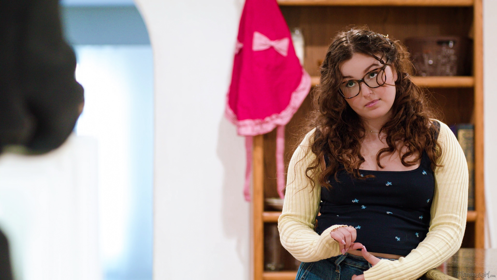 Little Puck gets up after some post-sex rest and is glad to see that the woman she hooked up with has already left. Puck then puts on a robe before leaving the bedroom, and goes to the kitchen. As Puck rummages around in the fridge, her stepdaughter Leana Lovings enters the kitchen, and they start having a conversation.However, when Puck steps out from behind the fridge door, Leana is shocked and tells Puck to look down. Puck does so and realizes that her robe fell open, revealing that she forgot to take off her strap-on dildo! Puck is startled and embarrassed, scrambling to cover up.Although she's still shocked, Leana becomes curious and asks what that thing was. Puck explains what a strap-on is, and how some people use it. Leana continues to ask questions, and it's soon revealed that Leana is a virgin. Becoming even more curious, Leana tries to convince Puck to have sex with her so she can see what it's like. Puck is shocked, but Leana is so cute and sweet as she pleads that Puck gives in, leading to an explorative and educational sex session for Leana.