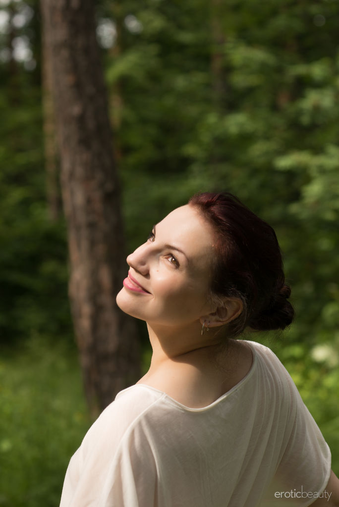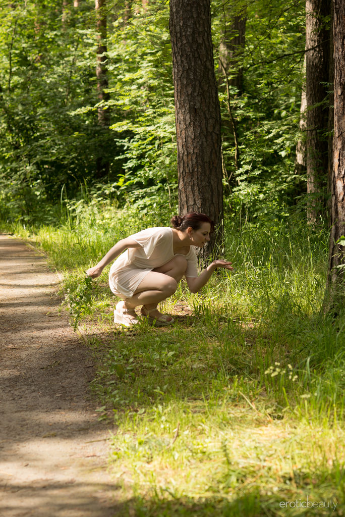 Lisa stands naked in the forest, shifting through daring, teasing poses that flaunt her natural breasts and sweet clit, radiating wild, irresistible allure.