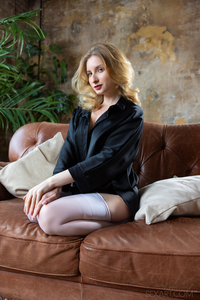 Stunning blonde Minnie Lighter opens her shirt to reveal she's not wearing lingerie, her lovely breasts and shaved pussy beautifully bare.