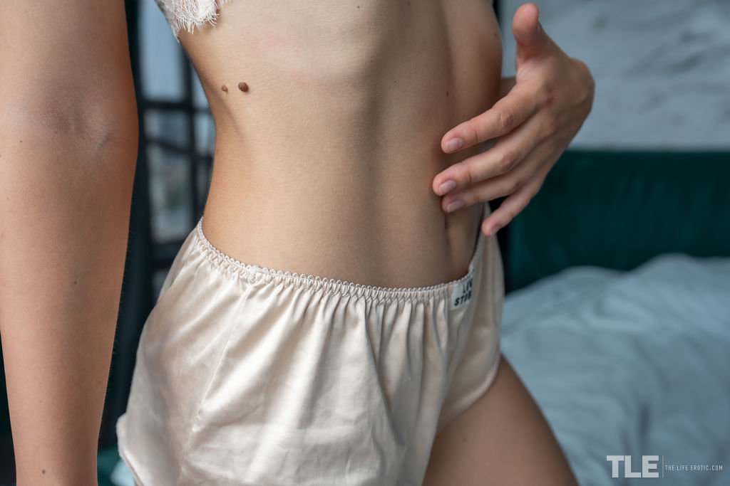 Cute as a button, Ukrainian brunette Roberta is taking a deserved day off – and, determined not to spend her precious free time on chores or errands, she slips on her favorite silk and lace lingerie, then chills out in her luxurious bedroom.