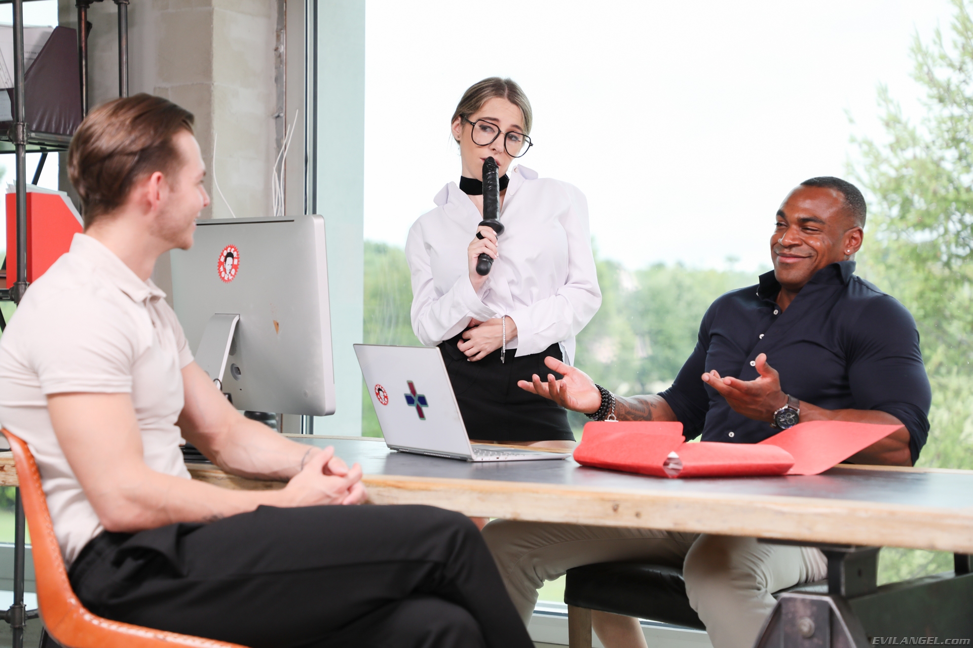 Office manager Aaron Rock interviews client Tommy Gold. They're unaware that cute secretary Safira walks away to play with a dildo. The petite blonde returns and boldly sucks on the phallus in front of them! She undoes her blouse, revealing her black bra and big tits. Aaron and Tommy flank Safira, fondling her tight body. She gives them daring, deepthroat blowjobs. Tommy licks her snatch. He fucks Safira's pussy while she sucks on Aaron big Black cock. Safira straddles Aaron, taking his prick in her poon as she rims Tommy. Next comes anal fun: Tommy and Aaron deliver double penetration, simultaneously railing Safira's twat and tush! She greedily licks Tommy's rod ass-to-mouth. Safira masturbates, and the men exchange her holes in more DP action. This workplace threesome builds to a creamy climax: Tommy spunks Safira's tongue, and Aaron unloads into her open mouth. Sperm spills from her lips and chin.