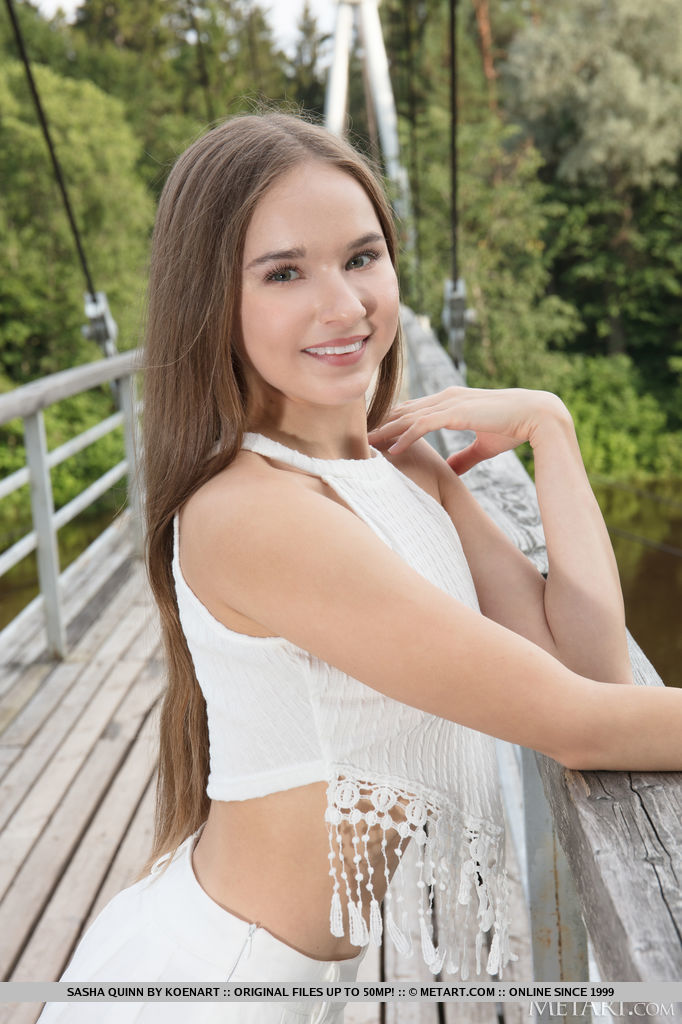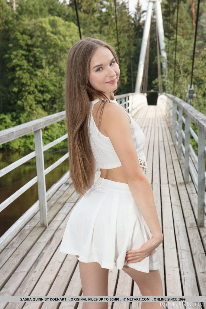 Stunning brunette Sasha Quinn turns the bridge across the river into her personal catwalk, sashaying across it in a cute white outfit that accentuates her flawless figure.