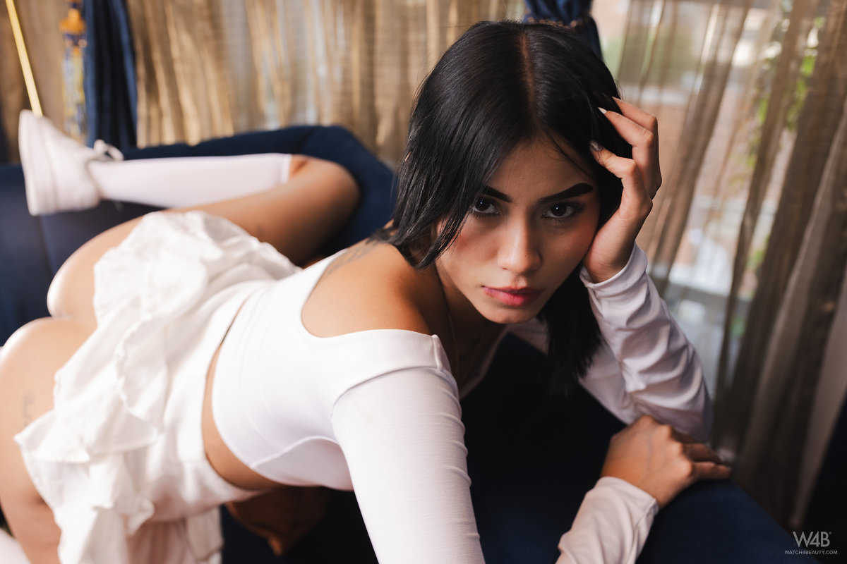 Sofia dressed up in a seductive white dress, which looked great on her in our dark apartment. As a Christmas gift, she will perform an exciting show with our traveling Fuck Machine for you. She spread her legs, opened her buttocks and let the Fuck Machine pound her from behind and from the front. She will soon be joining us for a big production in Spain.