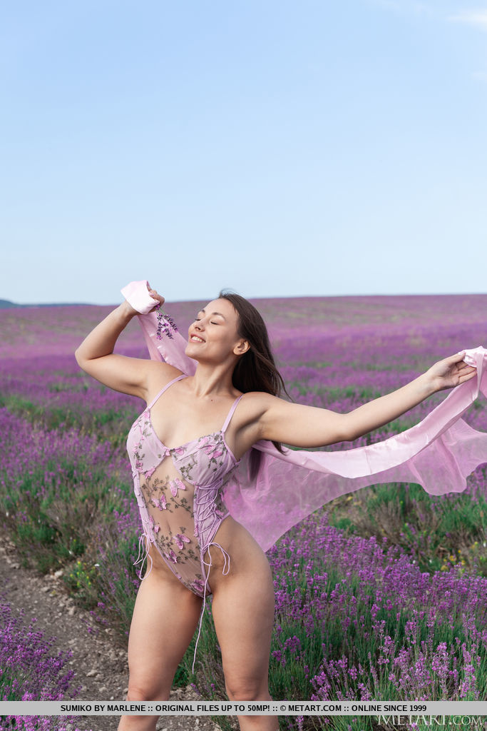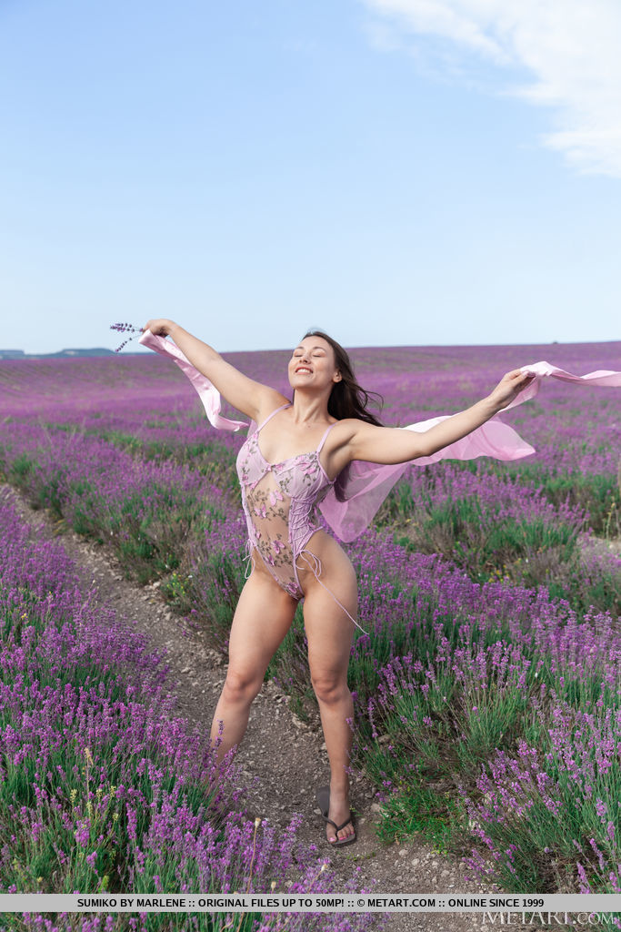 Voluptuous beauty Sumiko wanders through the fragrant lavender field in delicate lace lingerie that accentuates her gorgeous hourglass figure and is soon naked flaunting her lovely big breasts and luscious bubble butt exposed to the sun’s tender kiss.