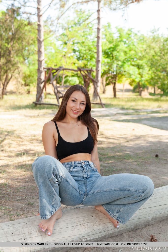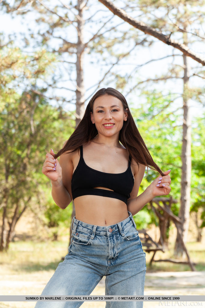 Voluptuous beauty Sumiko strolls through the park, her lovely big breasts bouncing in a skimpy crop top, and her baggy jeans hinting at the luscious curves beneath.