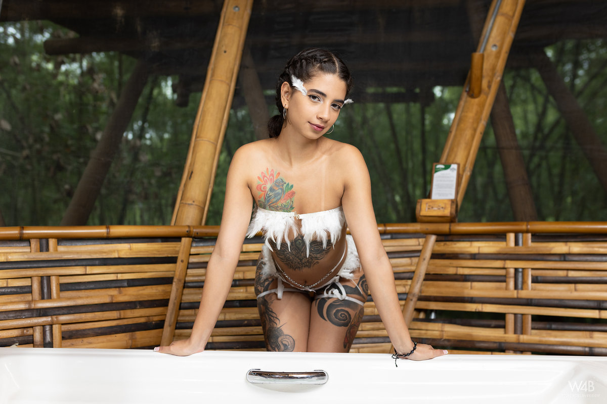 Our Top Model Tormenta creates and invents her own productions. Just by inviting her to a beautiful treehouse location, Tormenta has created some breathtaking sets. She came up with her own outfits and makeup, looking like an angel. She took a bath in the Jacuzzi and when she was warm enough, she took a glass dildo and had a long session with it.