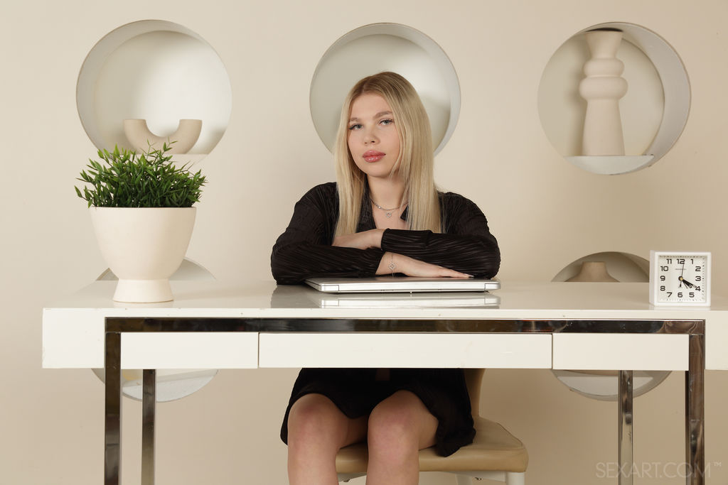 Cute Vanessa Ri sits at her desk, bathed in the soft glow of her screen. She’s dressed in a chic black shirt for her online meeting, but she’s neglected to wear anything except panties with it.